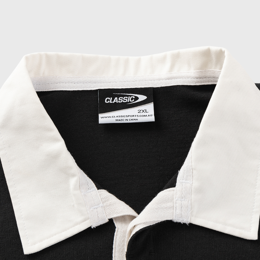 - A traditional long sleeve black rugby jersey, with red and white hoops design.