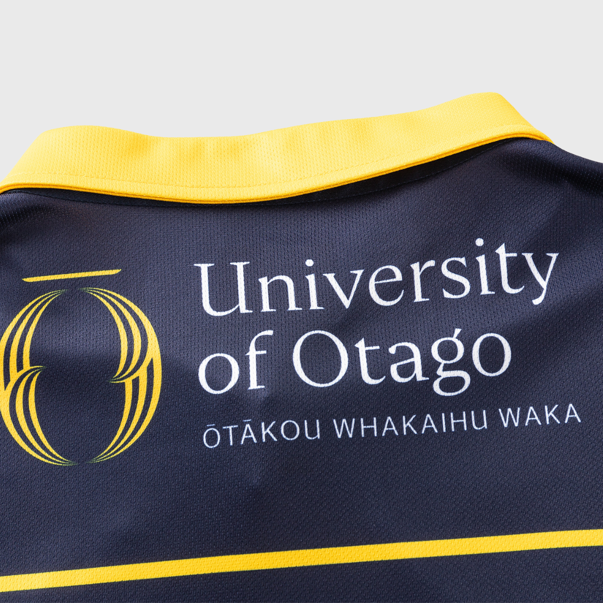 - The shirt features a classic blue rugby shirt with maroon and gold horizontal stripes.