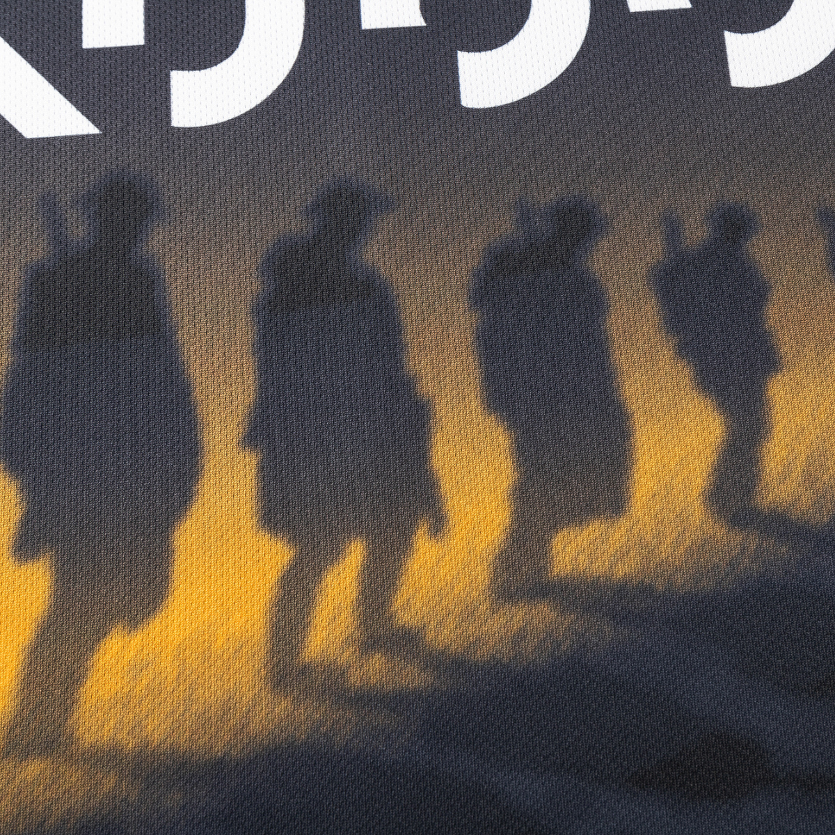 - The black shirt features subtle cultural patterning, along with yellow and blue accents.