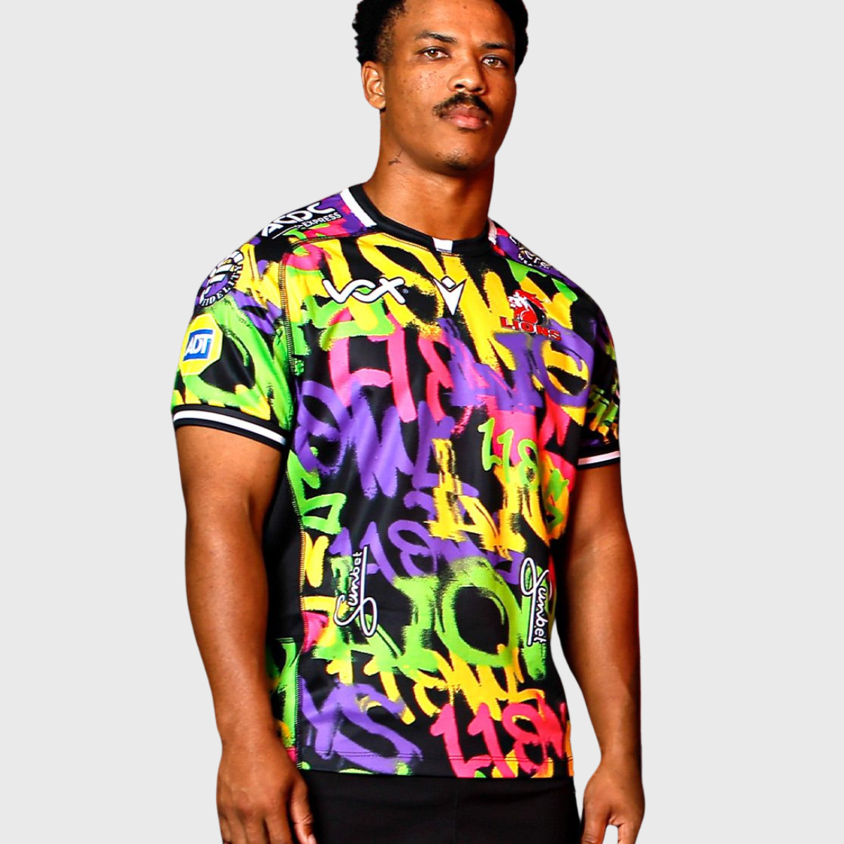 - Official Lions Rugby Design: Bold graffiti design throughout the shirt.