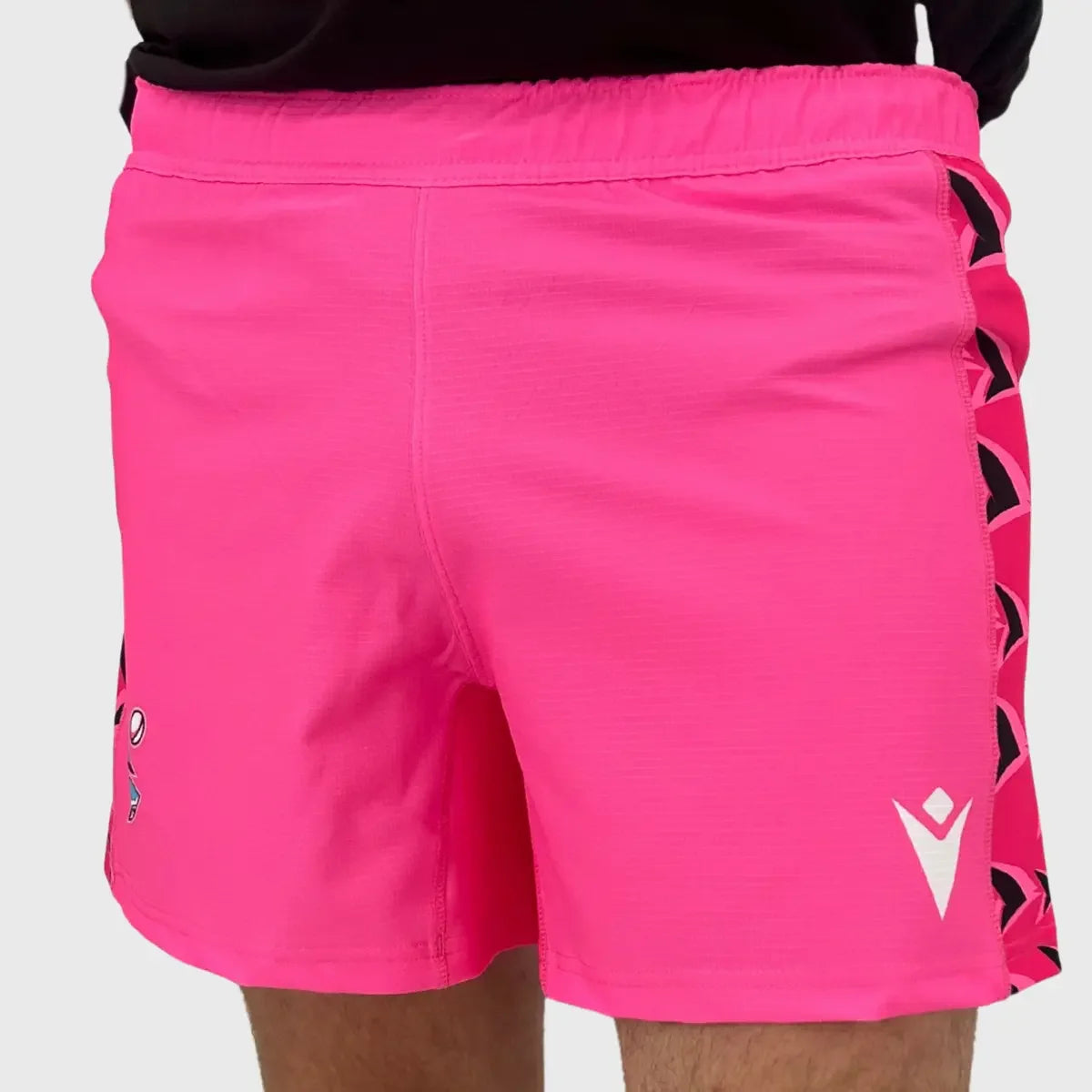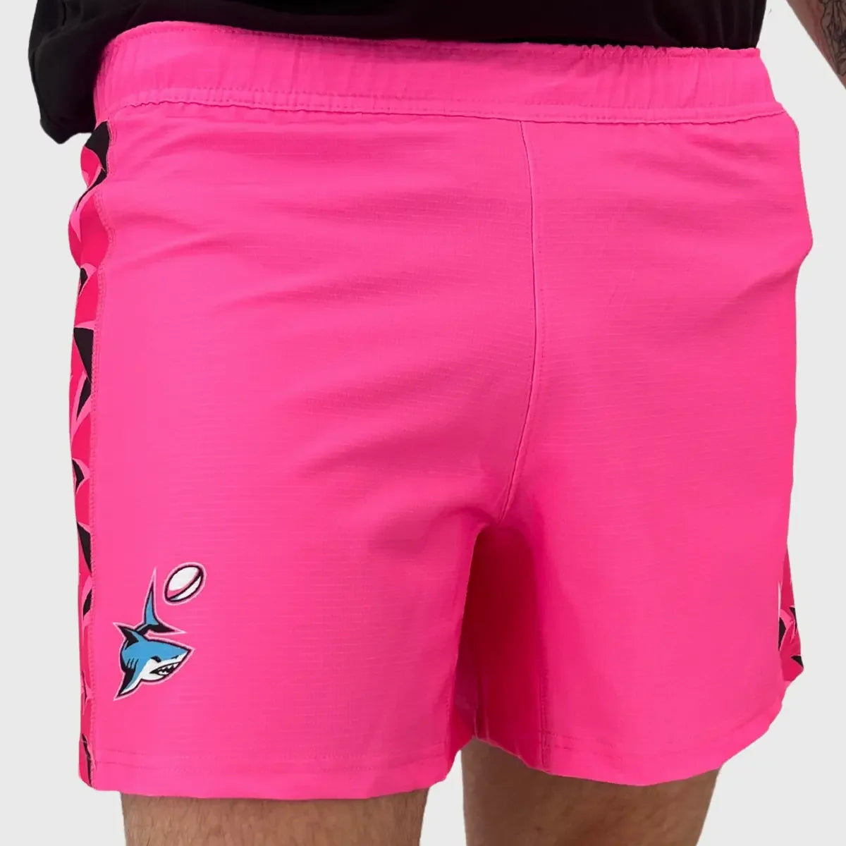 - Pink rugby shorts with shark fin graphic to the side panels.