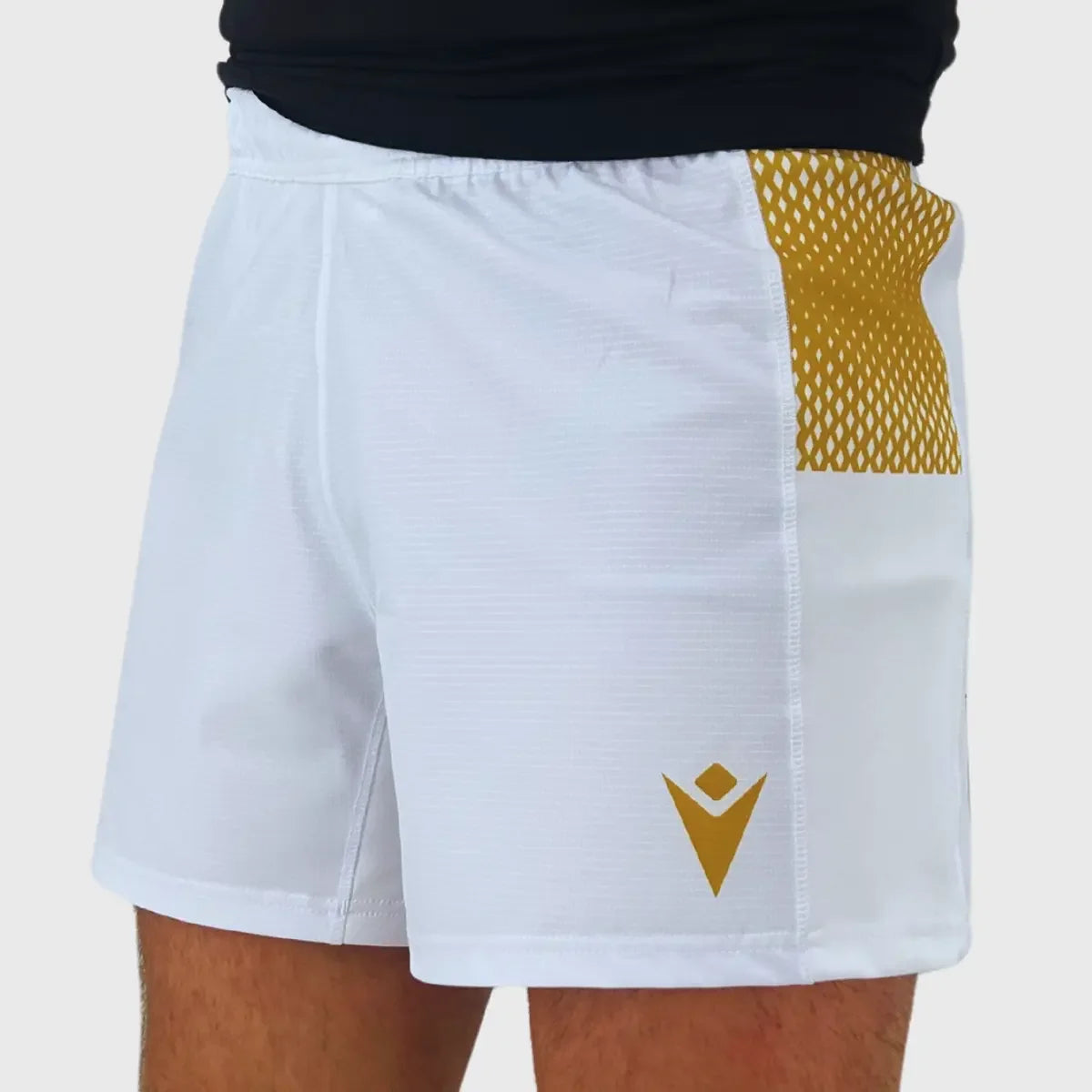 - White rugby shorts with gold and white side panels to match the NOLA Gold home shirt.