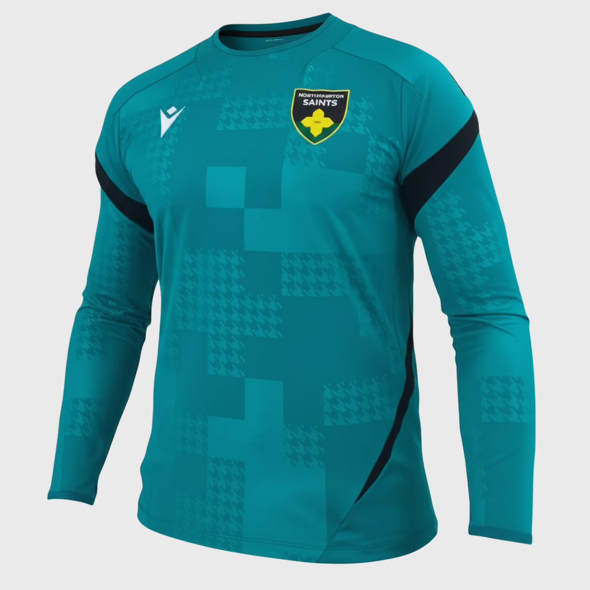 - Authentic Saints Branding: Embroidered Northampton Saints crest and Macron hero logo showcase official club identity.