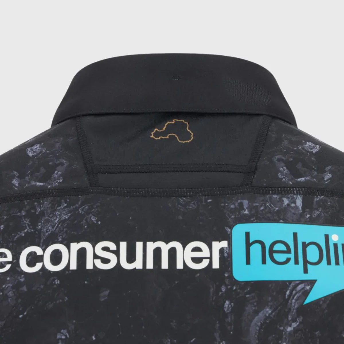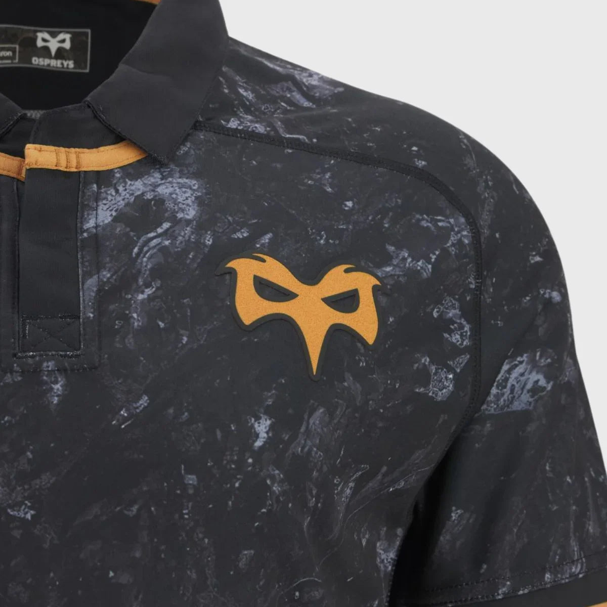 The Ospreys 2025/26 home replica shirt is a sleek black garment with an elegant design. It features a sublimated graphic across the shirt that takes inspiration from Swansea Bay, a nod to the club's local area. Bronze detailing on the sleeve cuffs and hem, along with a polo collar with buttons, gives the shirt a contemporary feel. The back of the shirt also showcases the Swansea Bay outline and the Ospreys logo in an embossed print.